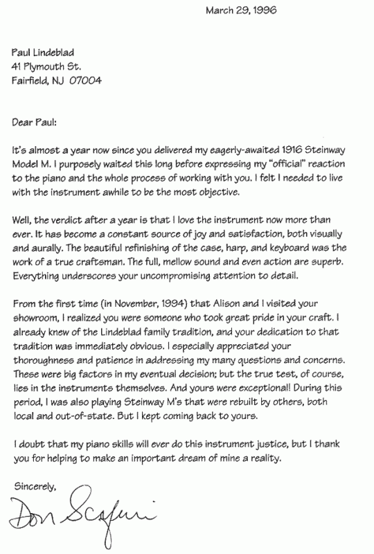 From the first time (in November 1994) that Alison and I visited your showroom, I realized you were someone who took great pride in your craft. I already knew of the Lindeblad family tradition, and your dedication to that tradition was immediately obvious. I especially appreciated your thoroughness and patience in addressing my many questions and concerns. These were big factors in my eventual decision; but the true test, of course, lies in the instruments themselves. And yours were exceptional! During this period, I was also playing Steinway M's that were rebuilt by others local and out-of-state. But I kept coming back to yours.