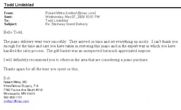The piano delivery went very smoothly. They arrived on time and set everything up nicely. I can't thank you enough for the time and care you have taken in restoring this piano and in the expert way in which you have handled the sales process. The gift basket was an unexpected but much appreciated surprise.