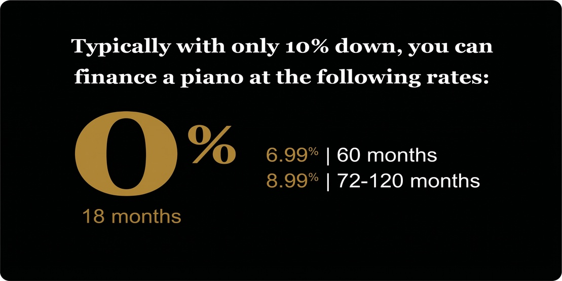 We are pleased to offer 0% financing for 18 months on all piano purchases and heirloom restorations. You can also benefit from $0 down on loans under $50,000, with a pre-qualification process that does not affect your credit score.