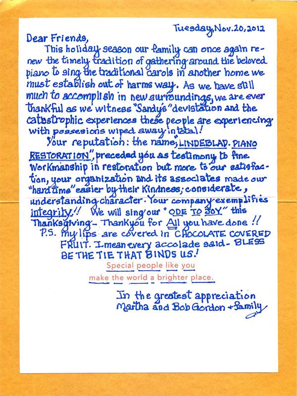 Your reputation: the name Lindeblad Piano Restoration, preceded you as testimony to fine workmanship in restoration but more to our satisfaction, your organization and its associates made our hard time easier by their kindness; considerate, understanding character. Your company exemplifies integrity. We will sing our Ode to Joy this Thanksgiving – Thankyou for all you have done!!