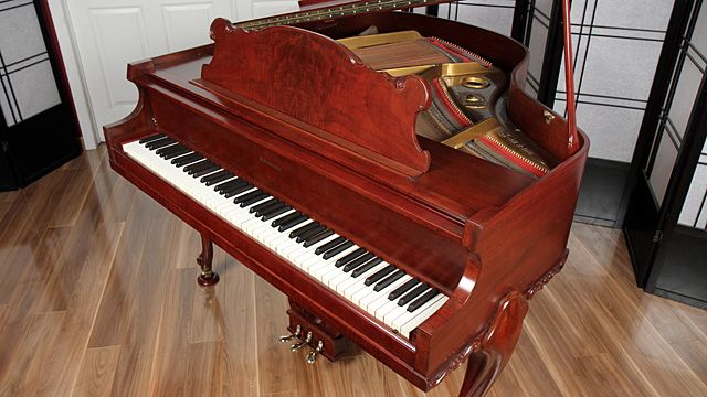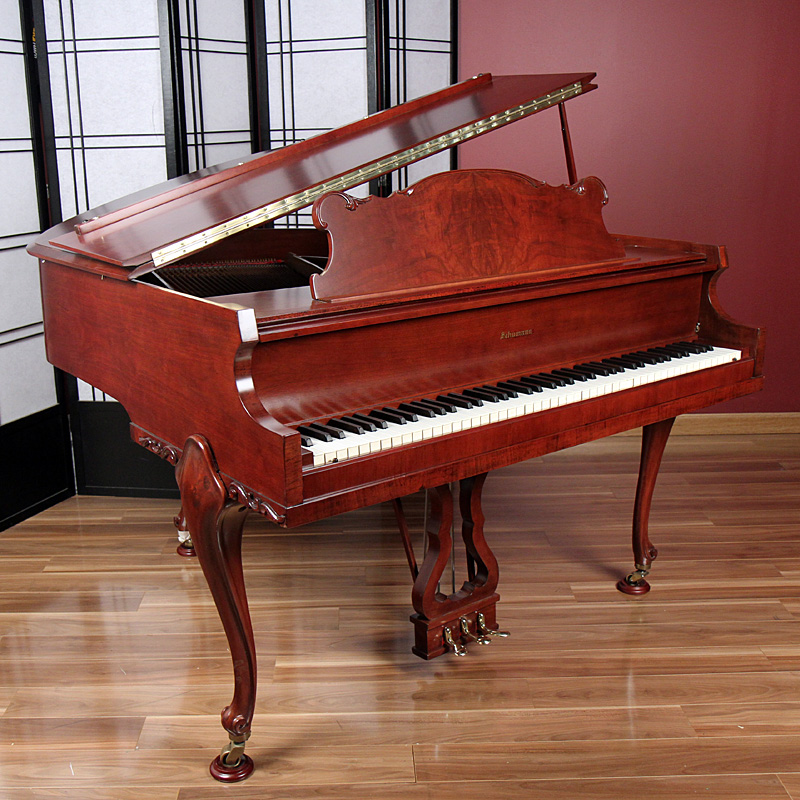 This is a Schumann petite grand piano with a beautiful Queen Anne case. Includes a matching bench.