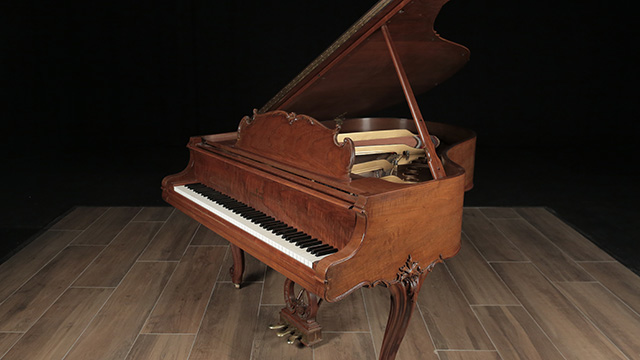 This rare Louis XV style piano is encased in a beautiful walnut cabinet with exquisite carvings. It has been mechanically restored and will be refinished in a stain of your choice. Includes a matching artist bench.
