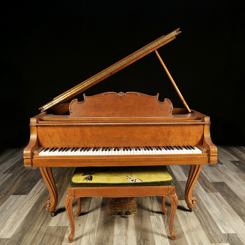 This Louis XV Model M has an excellent soundboard. It has exquisitely carved legs and a Walnut veneer. Contact us on how we can restore this beauty to its former glory. Includes the original matching bench shown.