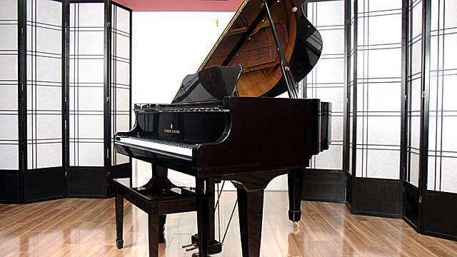 This is a Young Chang Model TG-150 baby grand built in 1989. It has a high-gloss ebony finish and comes with a matching bench.