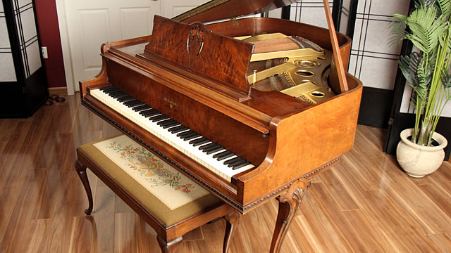This is a Queen Anne baby grand encased in burled walnut veneer.