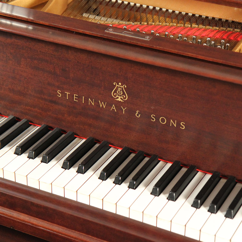 This Steinway O is currently in unrestored condition. It has a beautiful African Mahogany veneer, a set of ivory keys and a matching bench.
